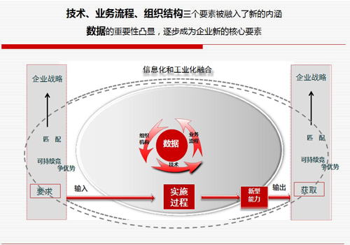 兩化融合,即工業化與信息化的深度融合,是一項國家戰略決策。通過在企業內部推行并建立一套管理體系,形成企業長期推動兩化融合的內在機制。輔助企業理清業務模式和業務流程,消除內部管理阻力;以制度創新保障技術創新、商業模式創新,形成良性循環。在操作層面體現為不斷推進數據、技術、業務流程、組織結構四個基本要素互動創新和持續優化的過程!
