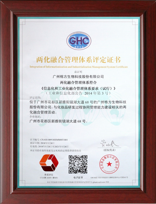 5月8日,棟方股份兩化融合管理體系順利通過專家組審核,獲得頒發兩化融合管理體系評定證書,成為率先通過該體系評估審核的化妝品研發制造企業。棟方股份成功實現兩化融合,企業競爭力將會得到進一步的提升,在管理水平和工作效率方面得到明顯改善,必會更好服務于客戶和市場。