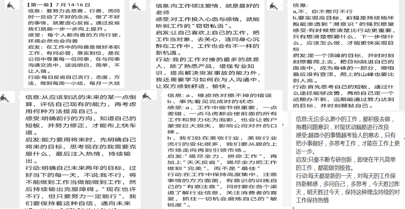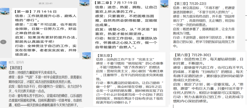 本期共讀通過線上說明會、共讀打卡積分、思維導圖引導共讀內容等多種學習方式,鼓勵大家合理利用碎片化時間學習。由人力資源部培訓經理張瑩擔任領讀人,每章共讀前發送共讀進度指引及思維導圖,大家跟隨領讀人的腳步,按時打卡,分享心得~人力資源部招聘培訓專員歐海欣擔任此次共讀管家,積分互動兩不誤!