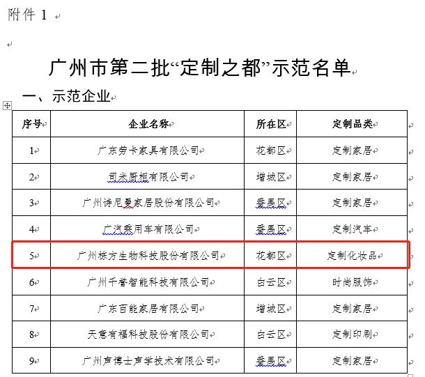 2021年10月20日,廣州市工業和信息化局官網公布了2021年廣州第二批“定制之都”示范單位入選名單,廣州棟方生物科技股份有限公司(簡稱:棟方股份)入選為9家“示范企業”之一,同時棟方股份成為唯一一家化妝品定制入選的企業,這是對棟方股份深耕化妝品研發、樹立化妝品行業標桿的認可。